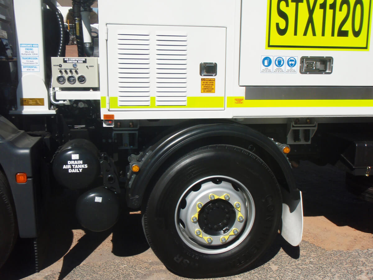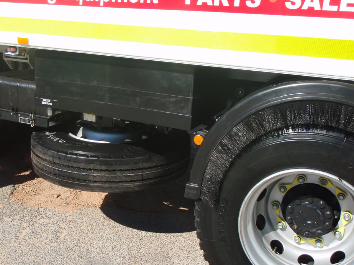 - 11R x 22.5 tyres x 13, individual wheel covers and heavy duty mud flaps, rear mounted spare wheel, jack & wheel brace