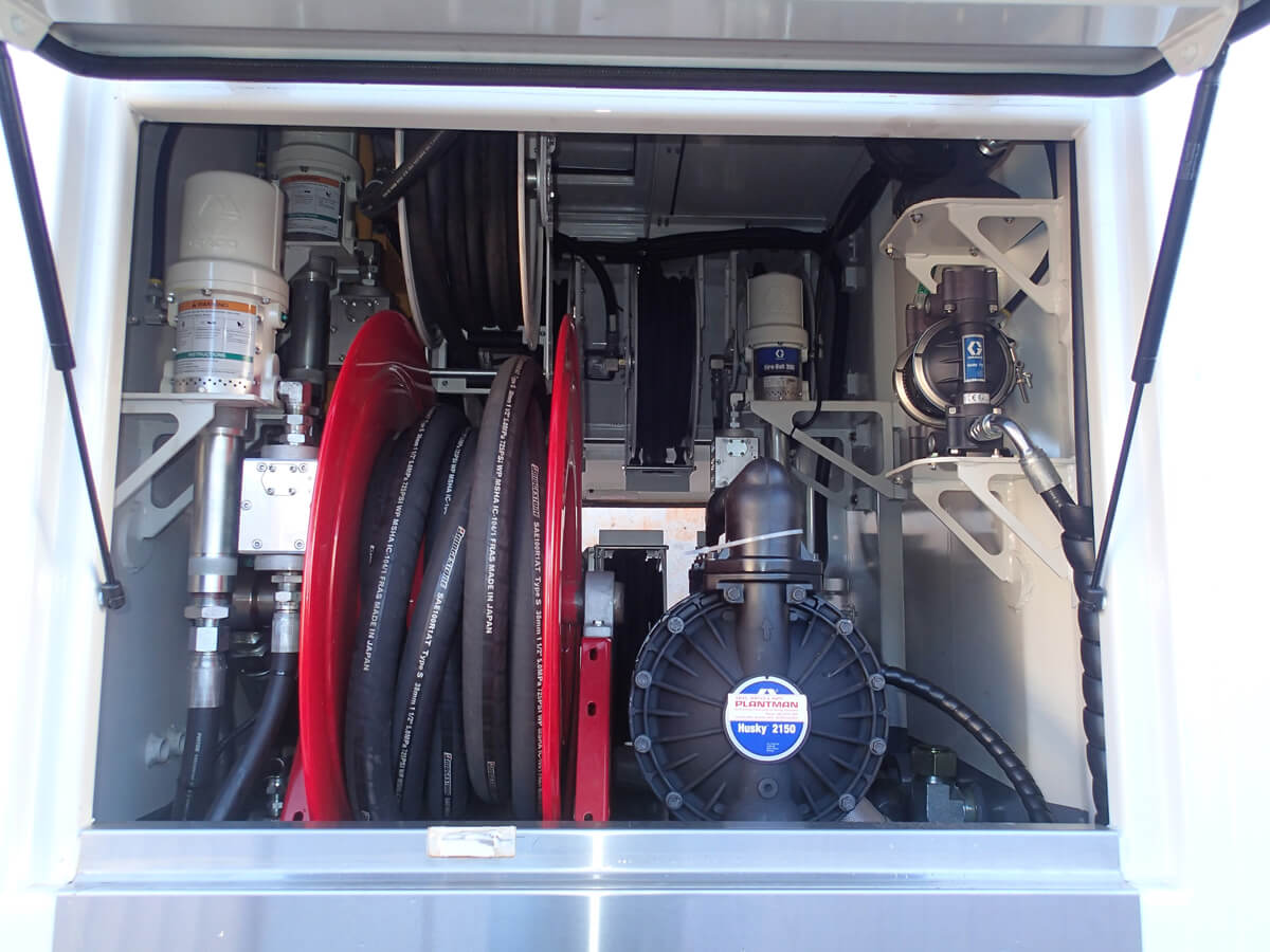 - 400kg Bulk grease tank – 2 pumps, reels, hoses, hand piece